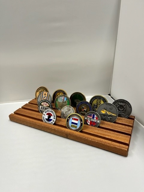 Handgemaakte coin display van 30cm lang.