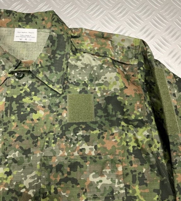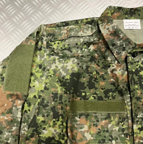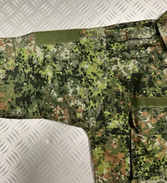 Voorzien van een klittenbandstrook voor naamlint, twee grote klittenband vakken op de mouwen, Klittenband op de borst voor eenheidsemblemen. Epauletten voor ROT. Verstelbaar in de zij.