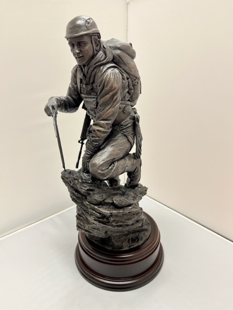 This is the cold cast bronze 12" Scale Alpine Mountaineering sculpture. Fully equipped for a tough ascent he is climbing a rock face wearing helmet, harness, crampons and carrying an ice axe. This statue makes a great gift for anyone who loves to climb summits, or as a reminder of a particular challenging climb.