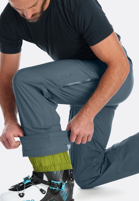 Snap adjustment at hem to accommodate ski boots, complete with internal snow gaiter