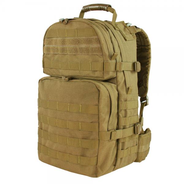 Mediumsize rugzak met een inhoud van 34 liter, verstelbaar padded harnas, compressiestraps, ruim voorzien van Molle, 2 voorvakken en groot hoofdcompartiment.
