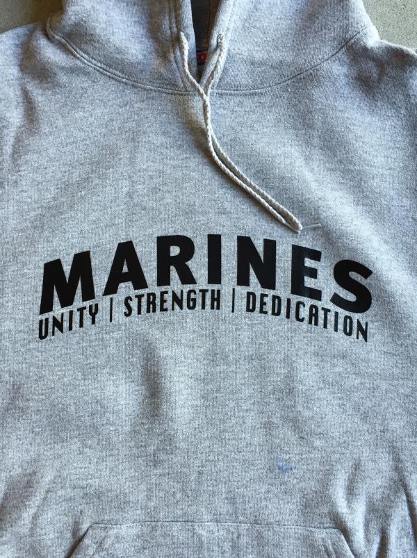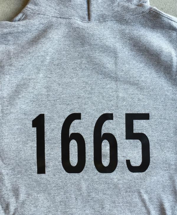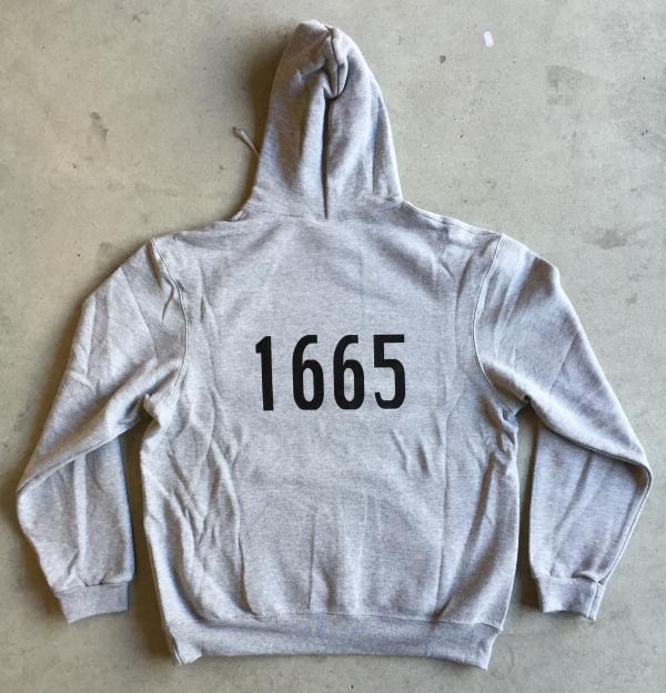 Sweatshirt met capuchon en steekzakken, bedrukt met de Korpswaarden aan de voorzijde en 1665 aan de achterzijde.